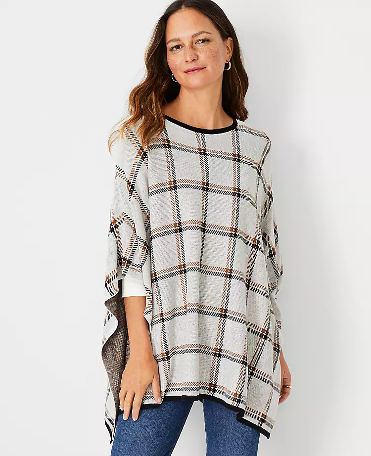 Our plaid jacquard poncho styles a relaxed silhouette that’s perfect for layering.
