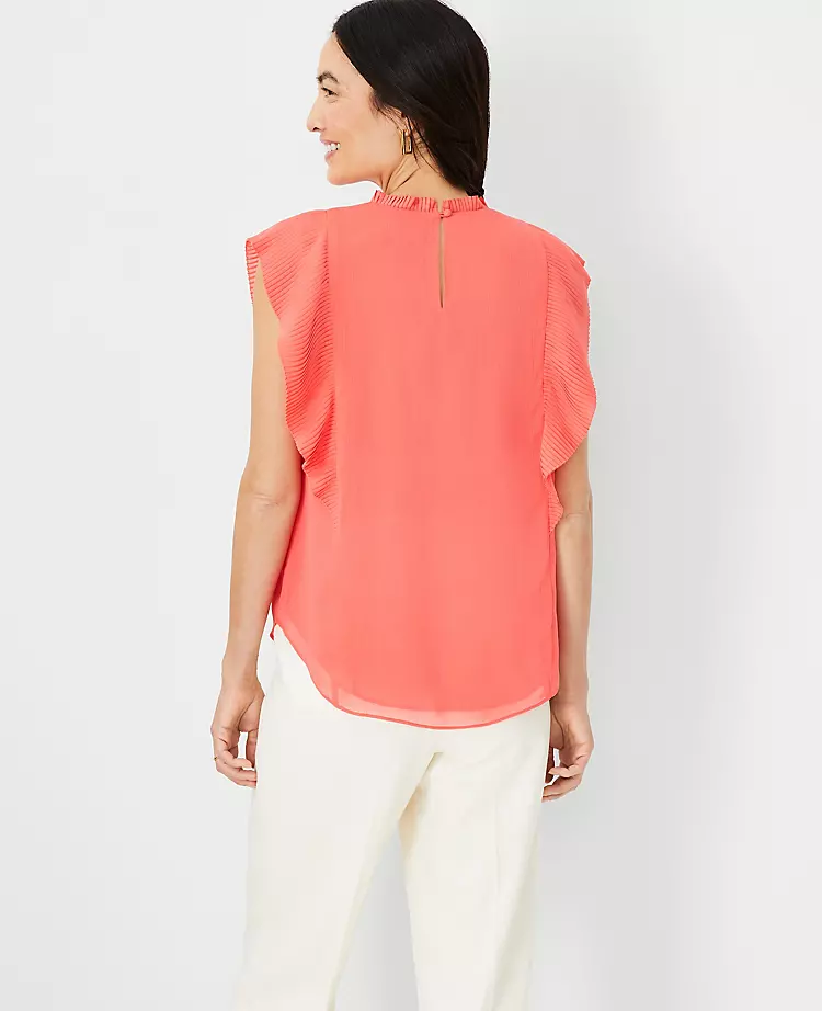 Plisse pleat ruffles add a fresh fold to our refined ruffle top. Ruffle jewel neck. Cascading ruffle flutter sleeves. Back slit with button closure. Shirttail hem. Lined.