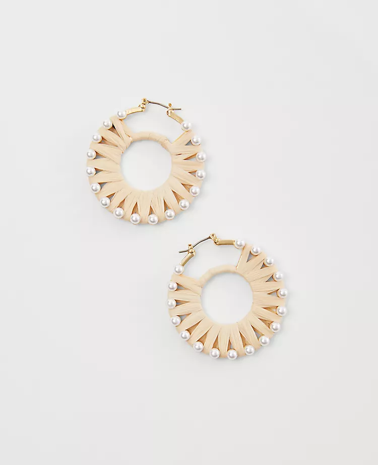 Artfully wrapped in raffia, these pearlized hoops provide a fresh spin. Lever back. 2″ width.