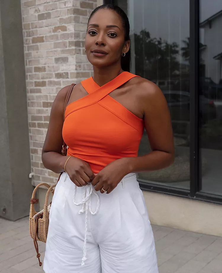 Endlessly soft, polished and flattering with a beautiful drape, our refined stretch fabric is irresistibly versatile and easy to wear – no matter where your day, night or travels take you. V-neck with crossover straps. Sleeveless. Square back.