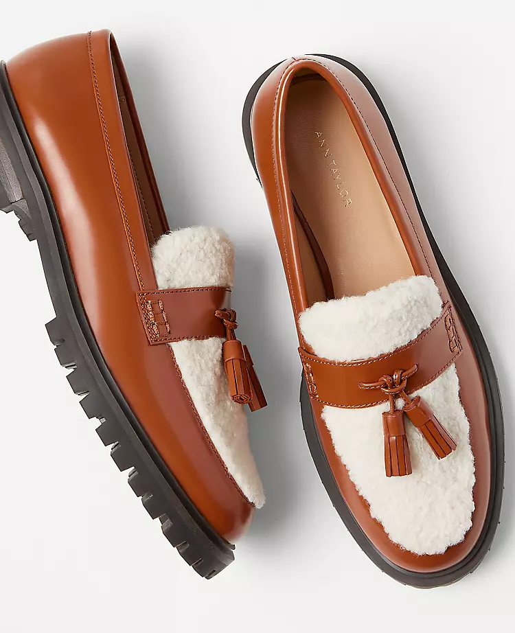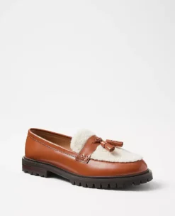 Comfortable and easy to style, our tasseled shearling loafers add a warm and cozy touch to any ensemble. Round toe. Padded footbed for complete comfort. 1″ heel.