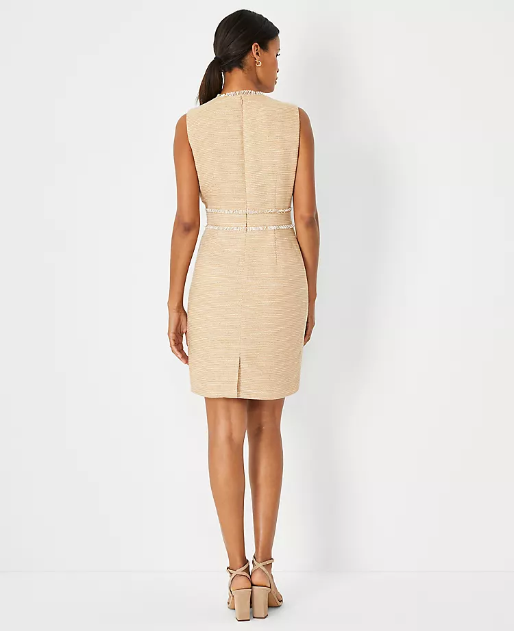 Infused with a hint of shimmer, our fringed button pocket sheath dress takes your look above the fray. Crew neck. Sleeveless. Front flap button welt pockets. Hidden back zipper with hook-and-eye closure. Back vent. Lined.