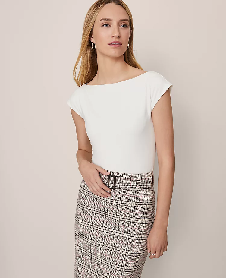 Versatile wardrobe staples like this boatneck top are the perfect foundation for any outfit. Boatneck. Front lined.