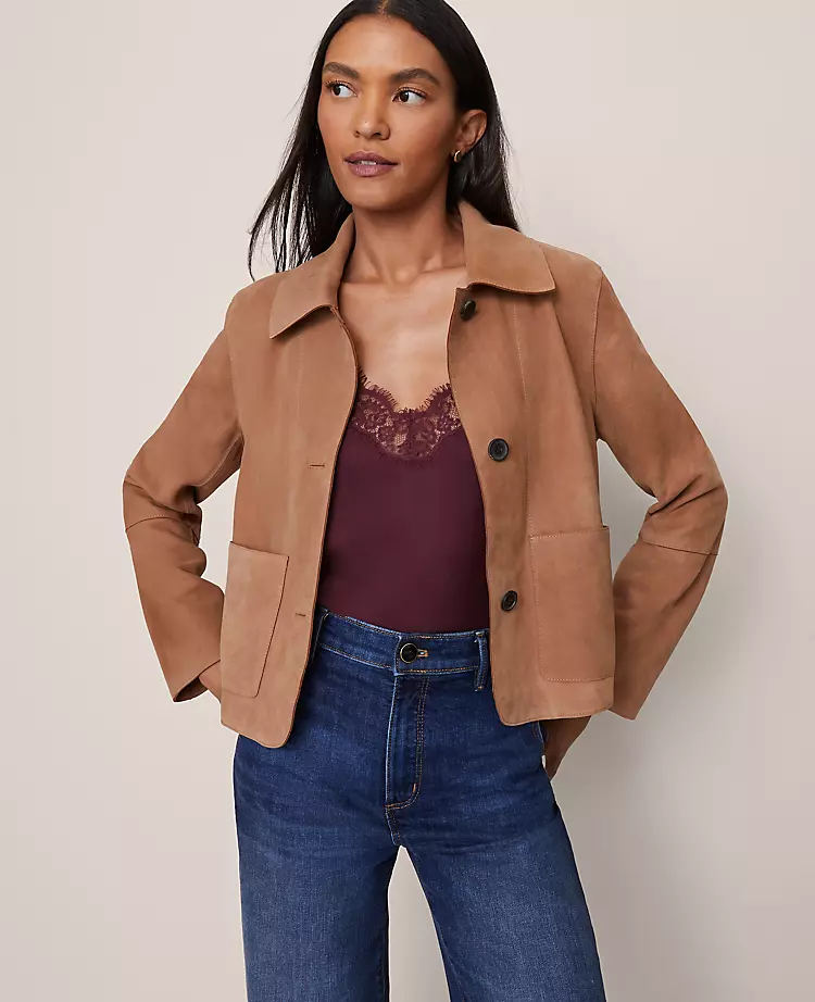 Exquisitely designed with premium fabrics and thoughtful details, this timeless piece will effortlessly elevate your style. This smooth suede jacket is the perfect layering option to wear over T-shirts and dresses alike. Point collar. Front value closures. Long sleeves. Front patch pockets. Lined.