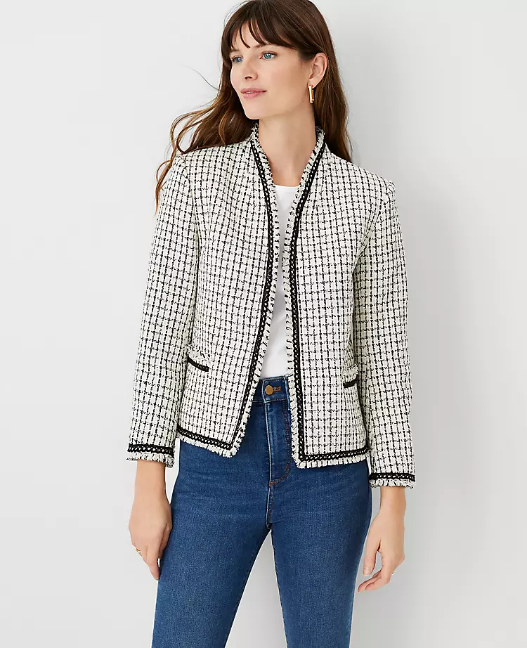 Raw-edged for extra fringe appeal, our cutaway tweed jacket is more than up to the job – any time of day (or night). Open front. Bracelet sleeves. Front welt pockets. Lined.
