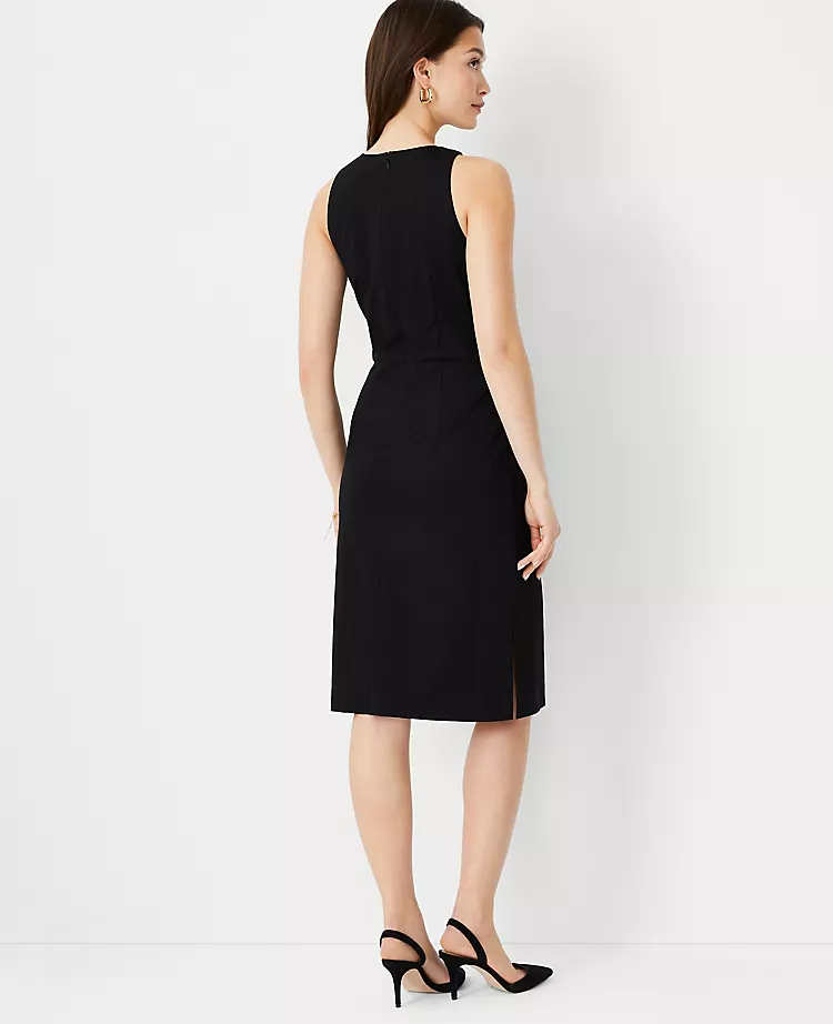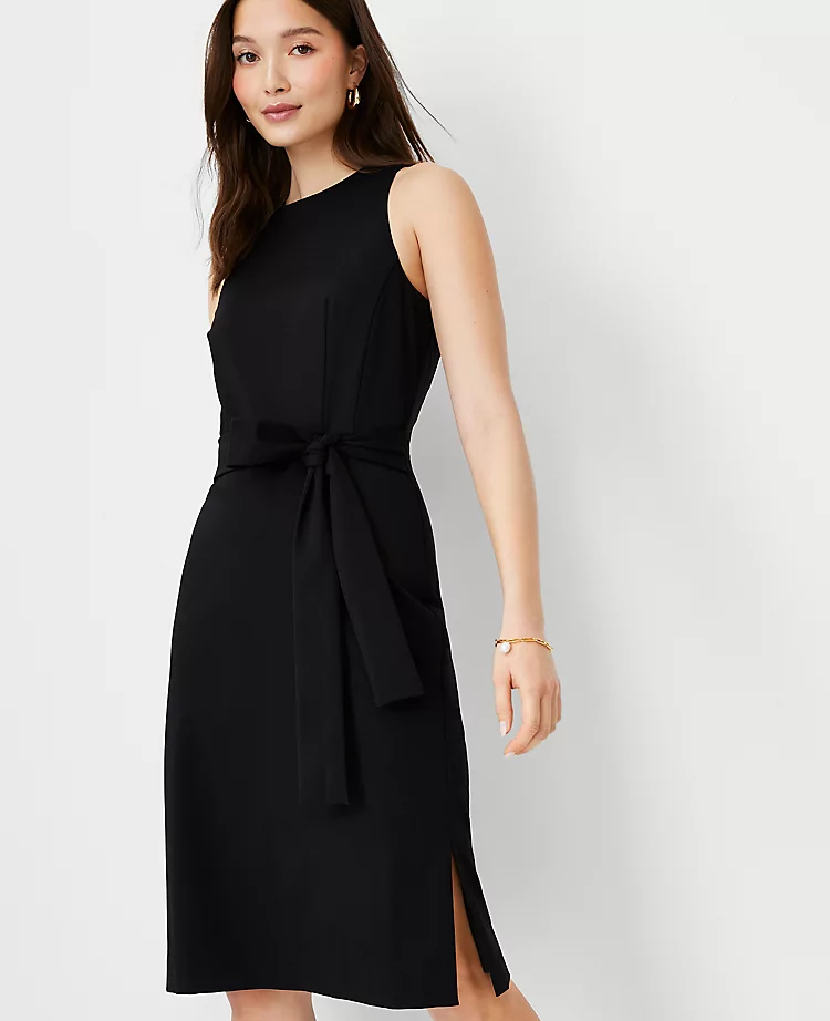 Cinched with a flattering tie waist, our cutaway shoulder knit dress works 24/7 – anywhere you wear it. Crew neck. Sleeveless. Self tie waist. Hidden back zipper with hook-and-eye closure. Side slits. Lined.