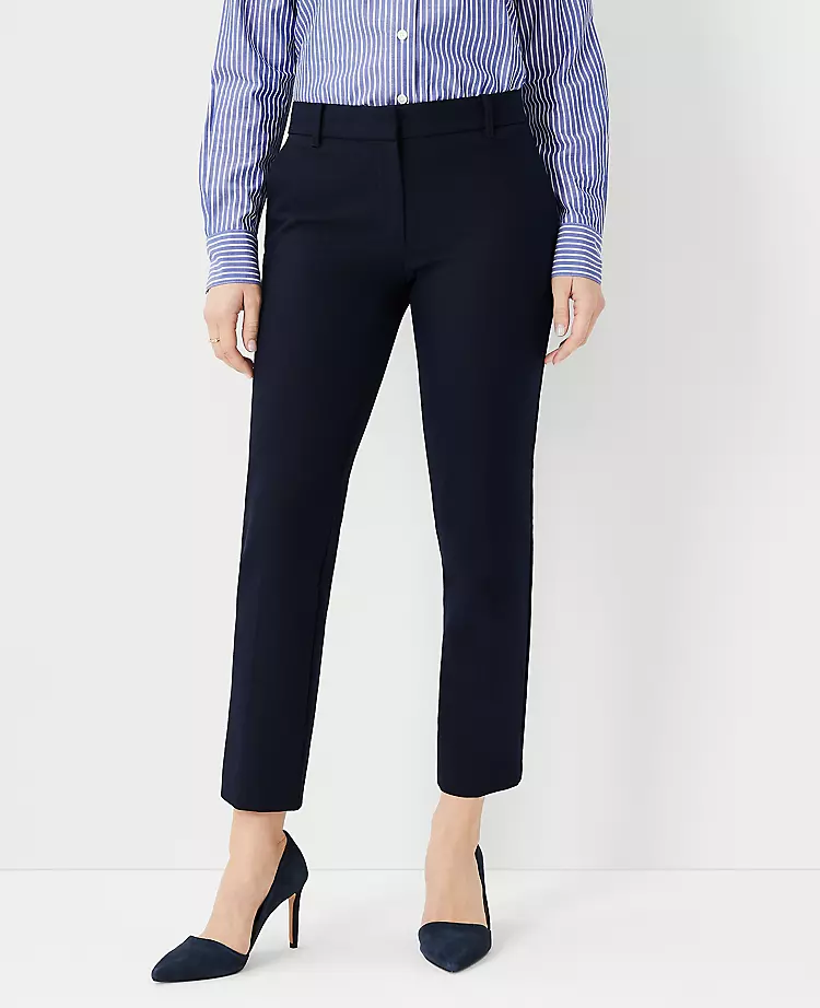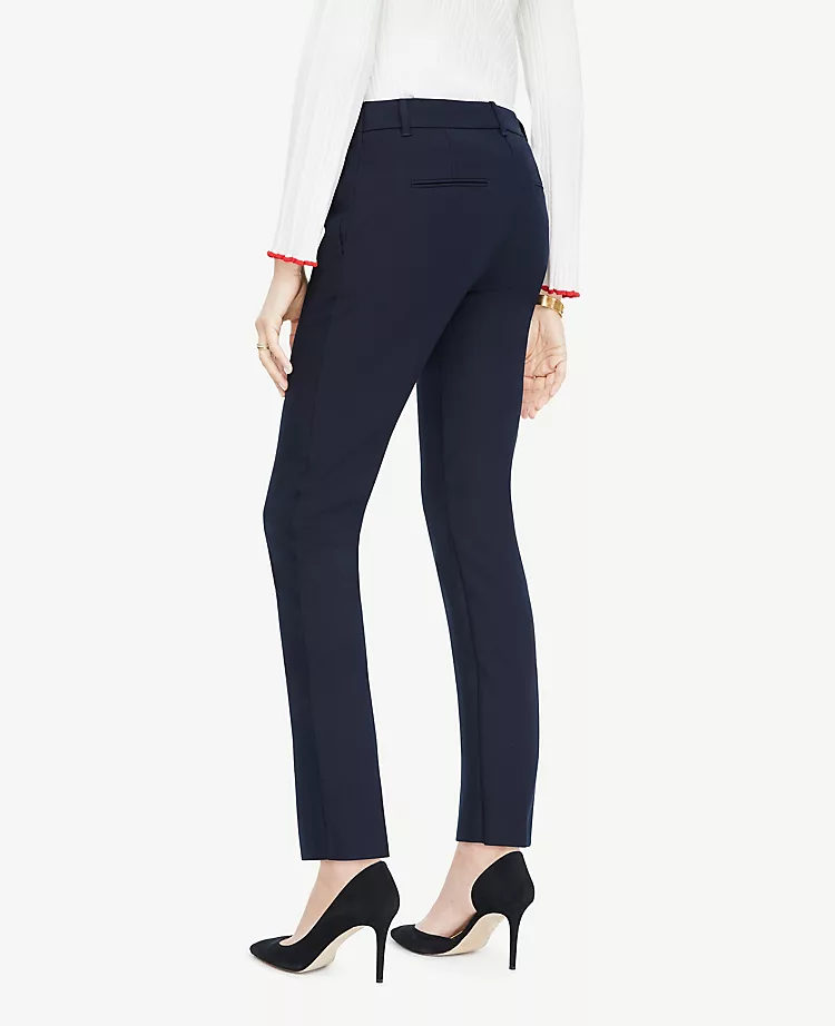Instantly streamline your style with a lean leg and ankle grazing crop. Front zip with hook-and-bar closure. Belt loops. Front off-seam pockets. Back besom pockets.
