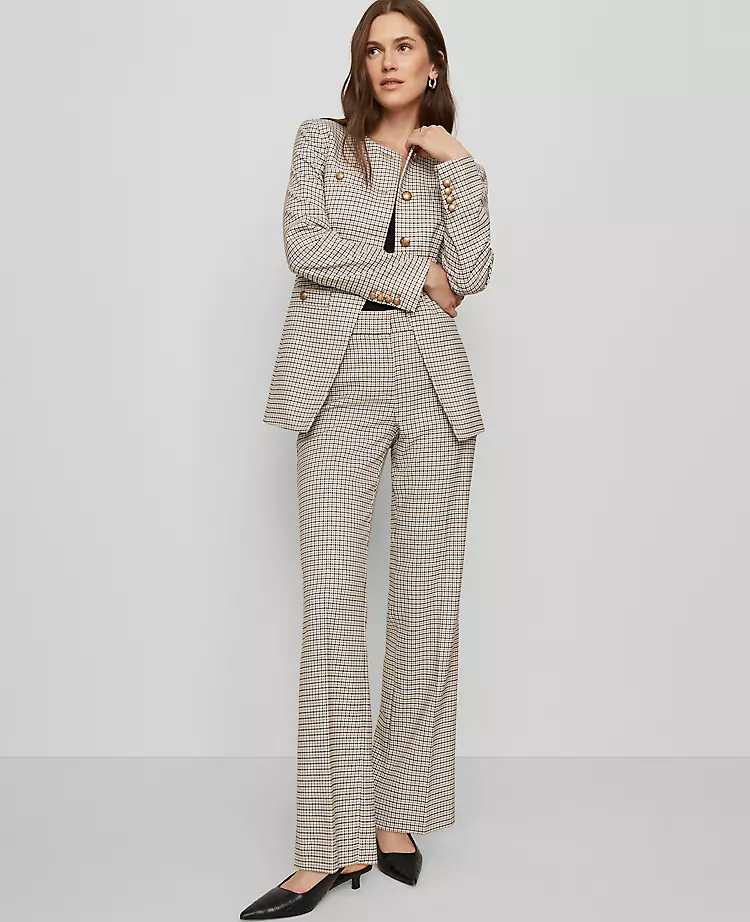 A classic leg-lengthening, slightly flared silhouette. Front zip with double hook-and-bar closure. Belt loops. Front off-seam pockets. Back besom pockets.