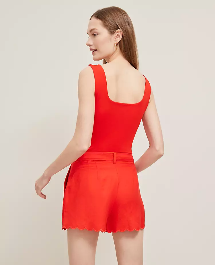 A scalloped hem adds a feminine finish to these perfectly polished shorts. Front zip with a value closure. Belt loops. Slash pockets.