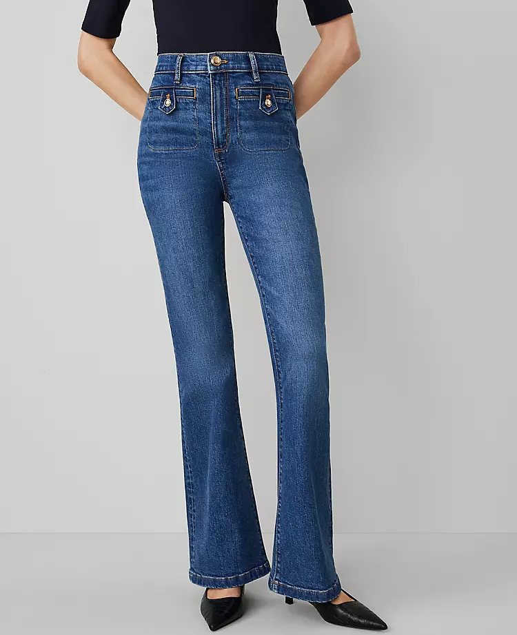 Our high-rise flare jeans are designed with new pockets that smooth, flatter and hold your shape. Performance stretch denim sculpts, shapes and supports all day long. Front zip with a value closure. Belt loops. Button tab welt pockets. Back patch pockets.