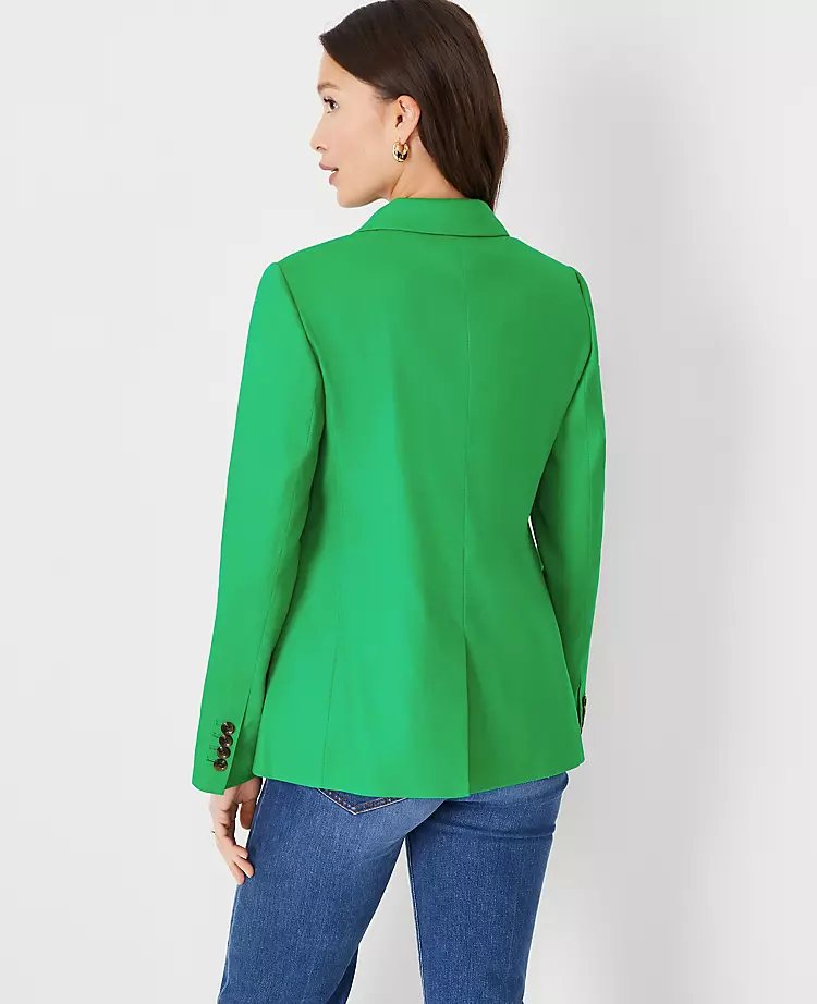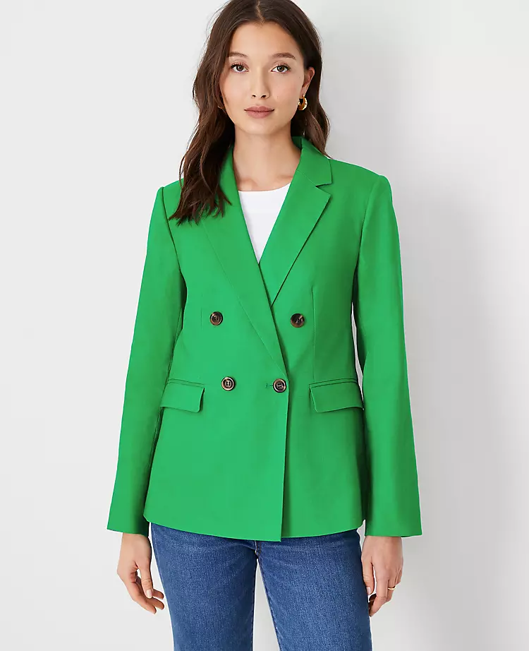 A modern update on the classic double-breasted style—with a more tailored fit that always looks pulled together. Notched lapel. Long sleeves with functional sleeve buttons for added styling options. Double breasted button front. Front flap besom pockets. Back vent. Lined.