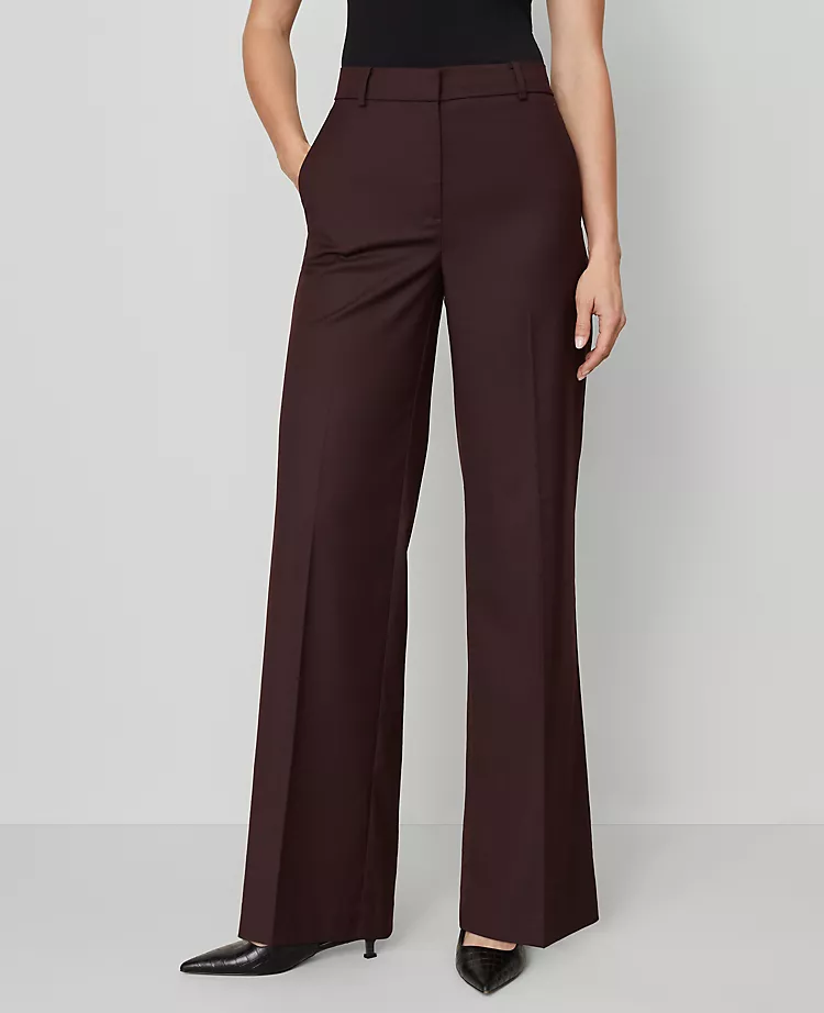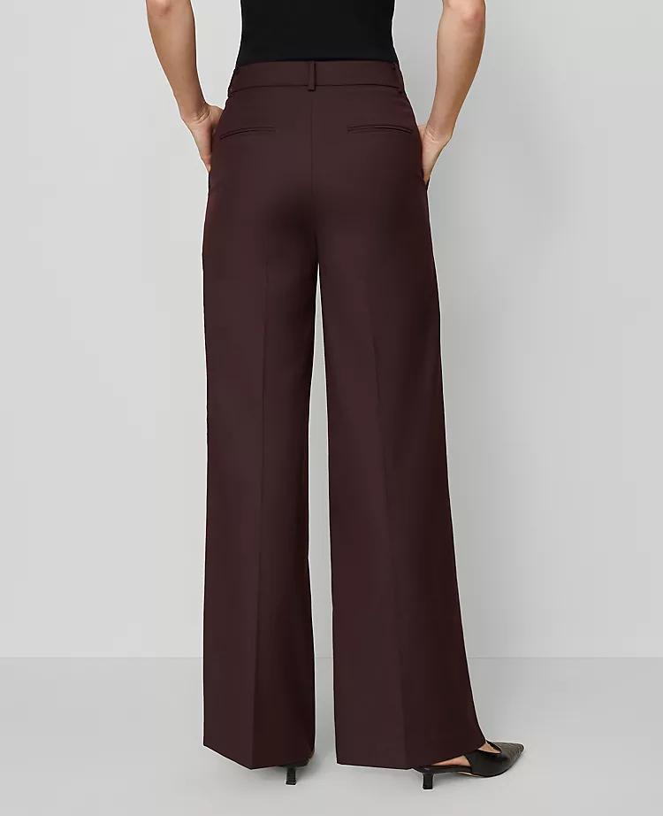 A modern must-have with a statement leg and flattering high waist. Front zip with a hook-and-bar closure. Belt loops. Front pleats. Front off-seam poclets. Back besom pockets.