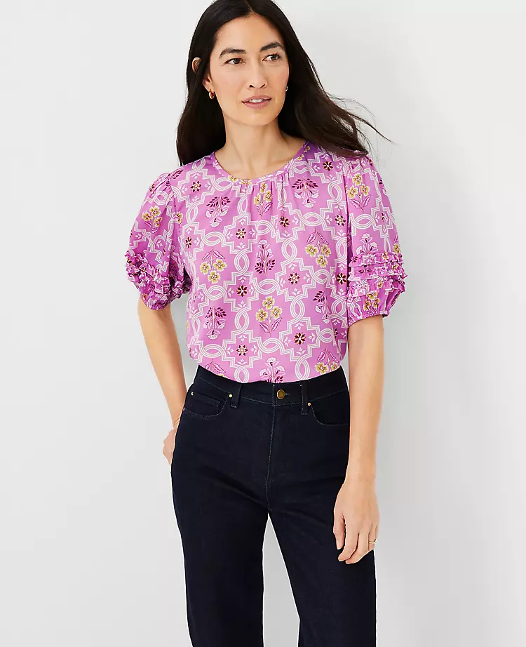 Rows of ruffles add romantic texture to the sleeves of this wear-anywhere top. Shirred jewel neck. Short sleeves with shirred sleeve caps and elasticized cuffs. Back slit with button closure.