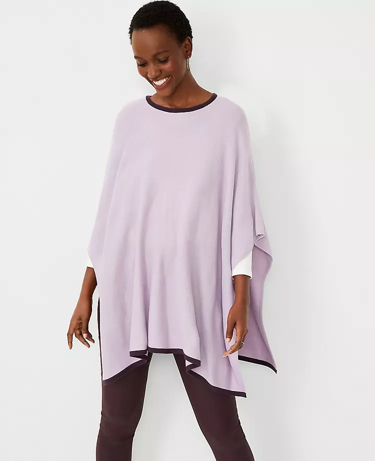 Perfect for cool days and nights, our chic contrast tipped poncho is a layer to love. Round neck.