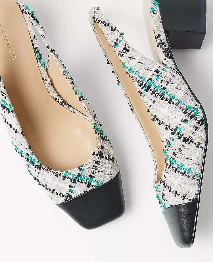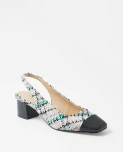 We designed these refined tweed cap toe slingbacks with a comfortable block heel, for an irresistible pairing. Square cap toe. Padded footbed for complete comfort. 2″ heel