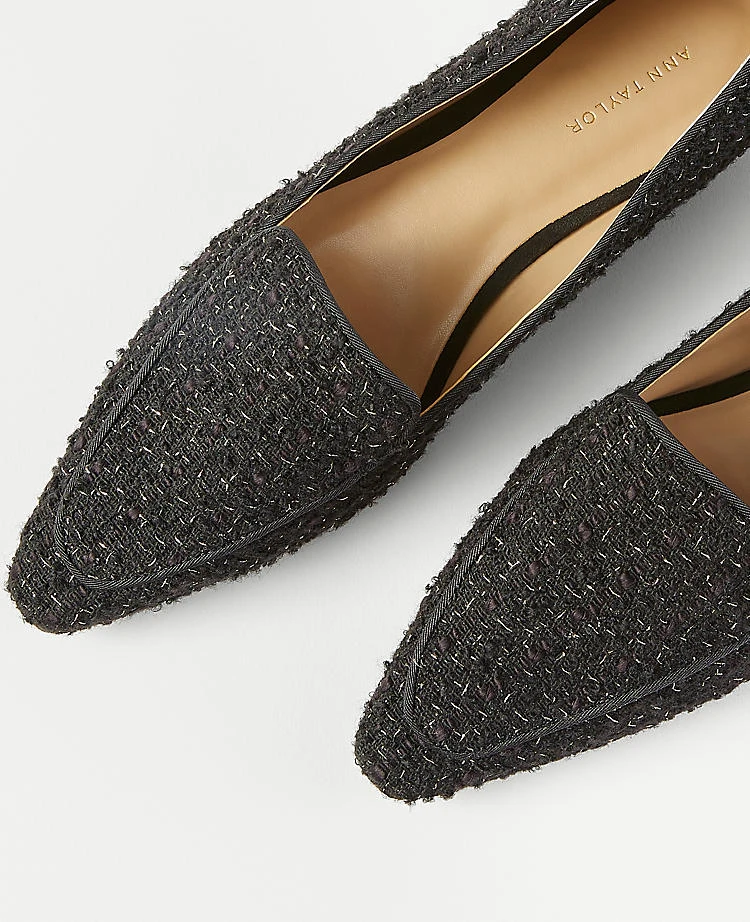 Crafted in refined tweed, our pointy toe flats lead the way. Pointy toe. Padded footbed for complete comfort. 1/2″ heel.