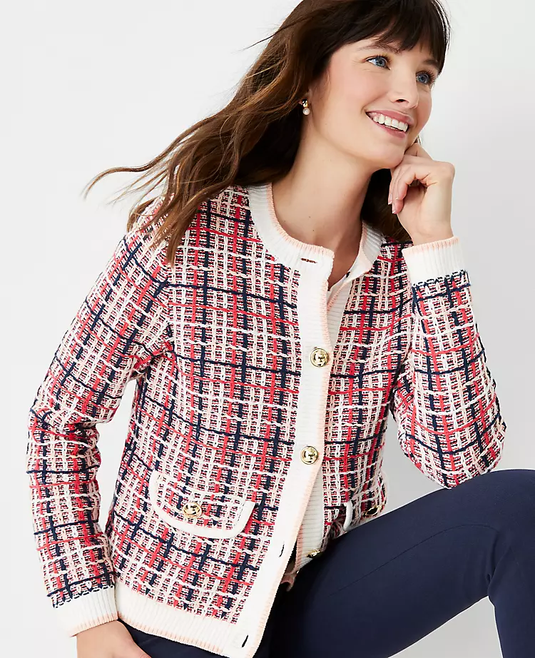 Texturally refined, this tweedy sweater jacket is polished with shiny button detail. Crew neck. Long sleeves. Button front. Flap button pockets.