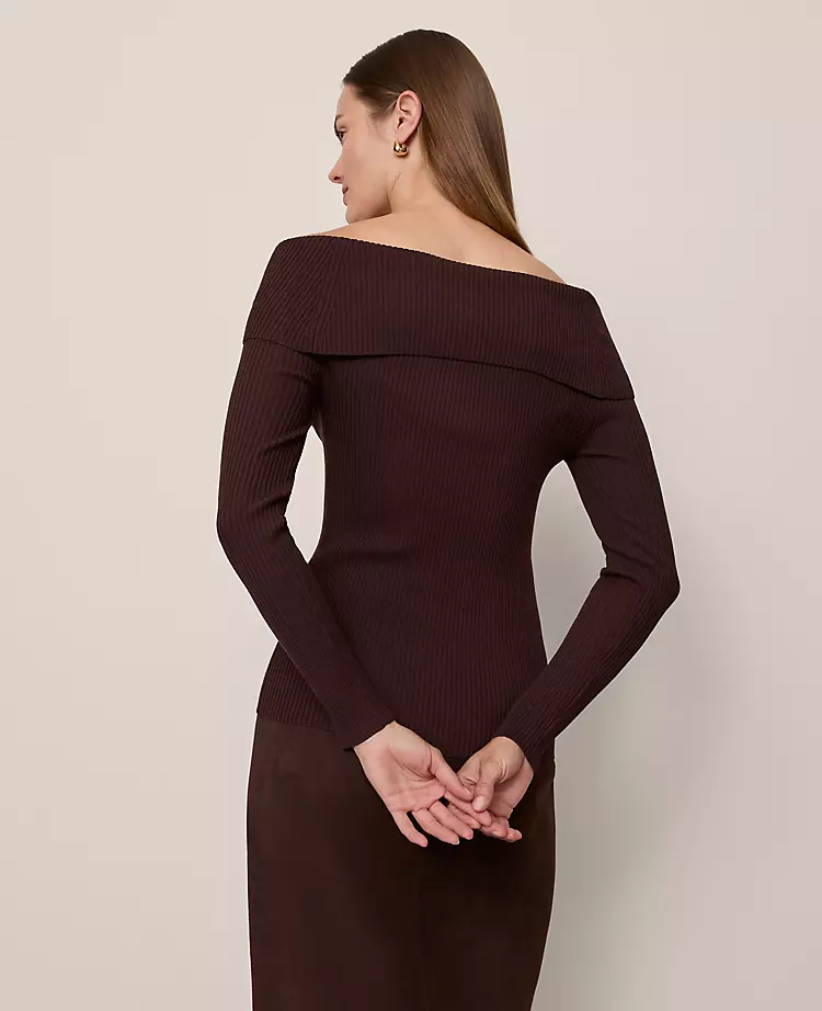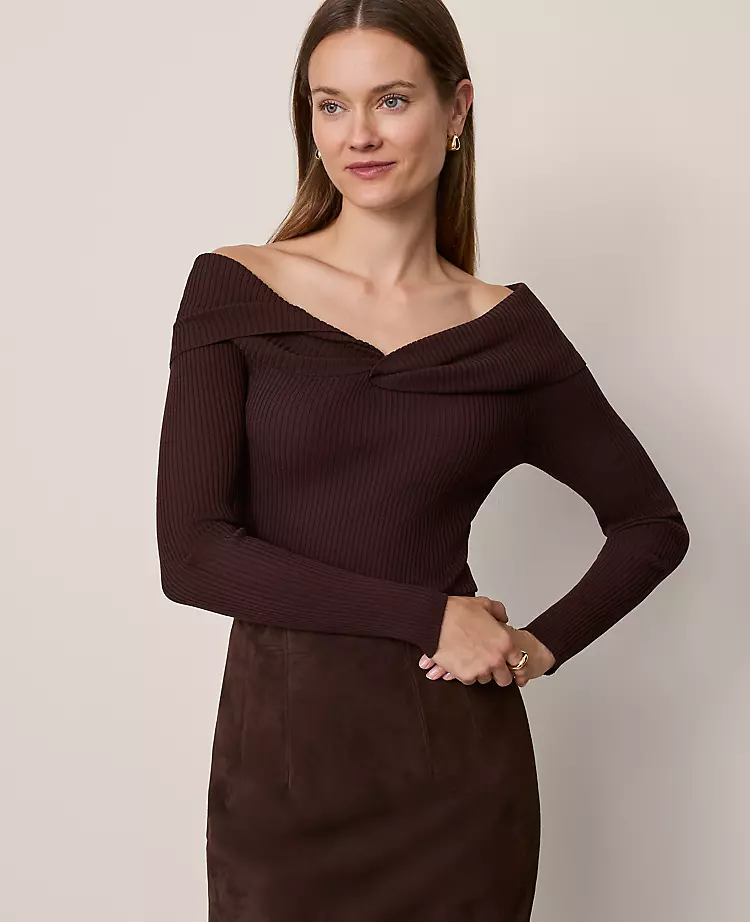 An elegant off-the-shoulder neckline is enriched by artful twisted detailing for a effortlessly romantic appeal. Boat neck. Long sleeves.