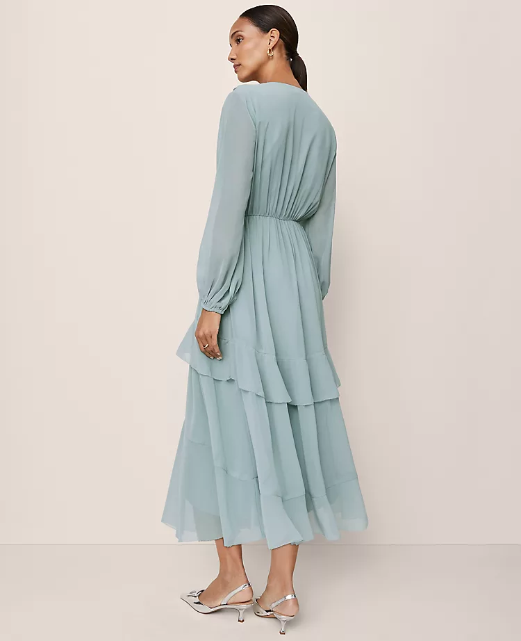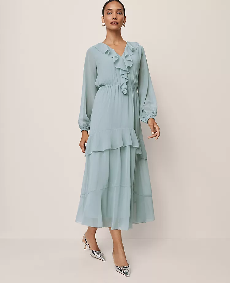 Flouncy ruffles and a delicate tie neck lend this maxi dress the perfect romantic feel. Round neck with ties. Long blouson sleeves with elasticized bell cuffs. Lined body.