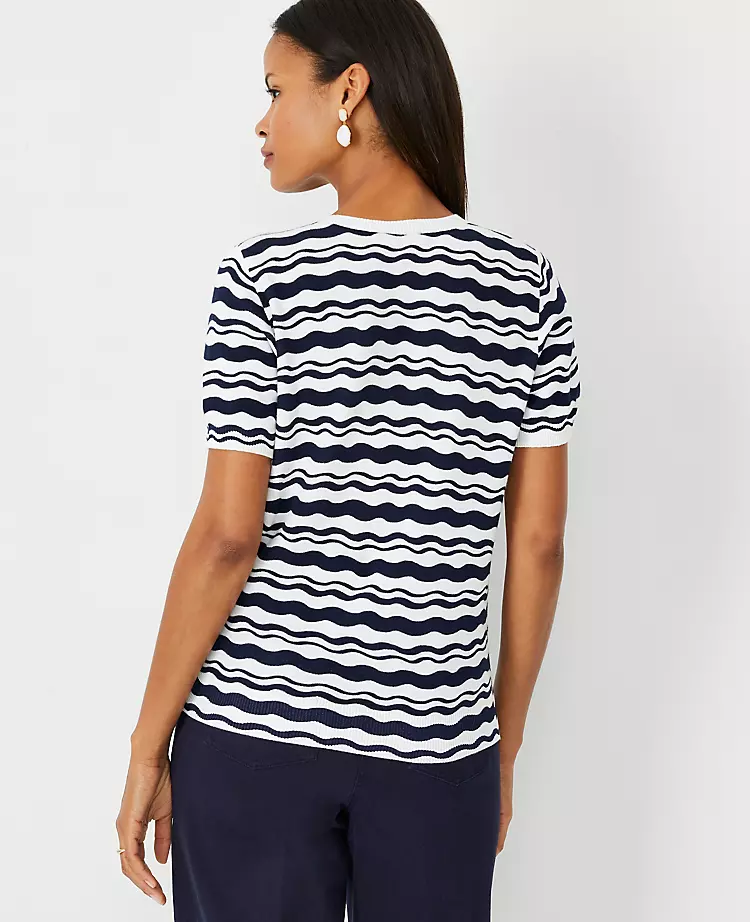 Our short sleeve sweater gives you warmth and style without the weight. Crew neck. Short sleeves. Ribbed neckline, cuffs and hem.