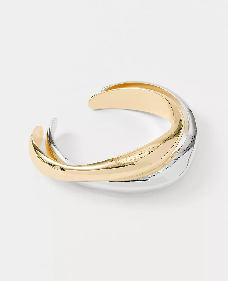 This wavy metal cuff gives any look a modern, artful appeal. Silvertone and goldtone finish.