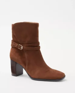 Our rich suede booties are boosted with wraparound buckle straps and a standout block heel. Pointy toe. Adjustable buckle at side ankle for secure fit. Padded footbed for complete comfort. 2 3/4″ heel. 5 1/4″ shaft circumference.